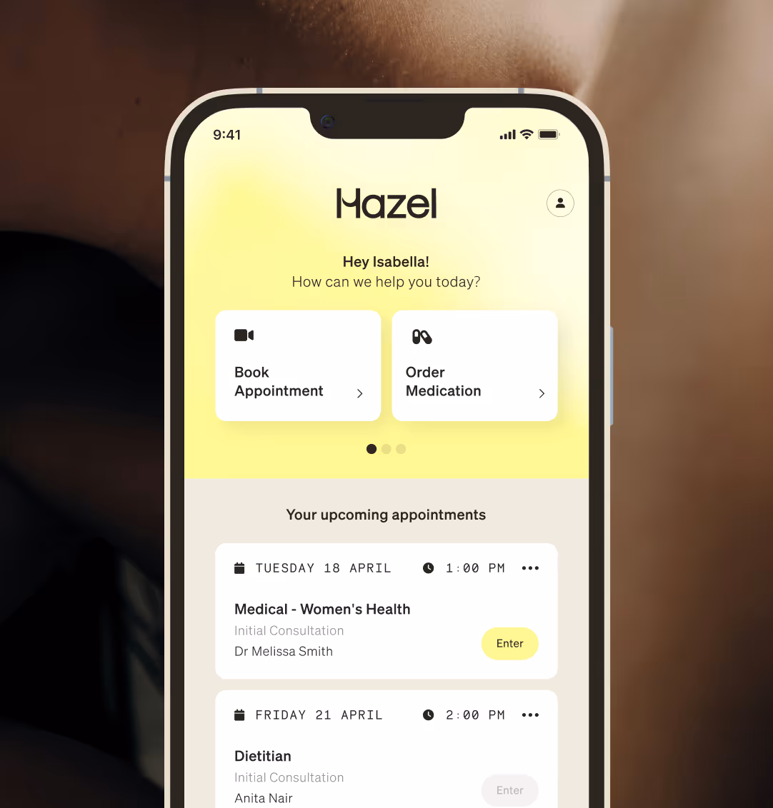 From painful periods and fertility challenges to perimenopause and chronic conditions, Hazel makes care simple and accessible, wherever you live. Through our online platform, you’ll have fast access to expert doctors, treatments, and a multidisciplinary team who listen, trust your experience, and provide the tailored care and solutions you deserve.